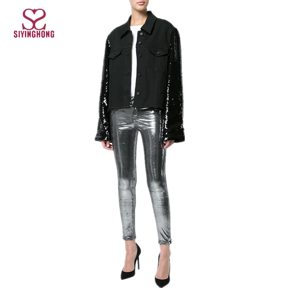 long sleeve sequined sleeve denim jacket for women and ladies
