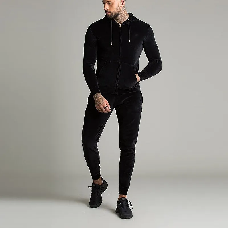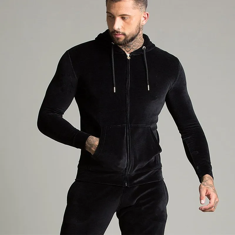 Full zip drawstring adjustable hood track top black velour tracksuits