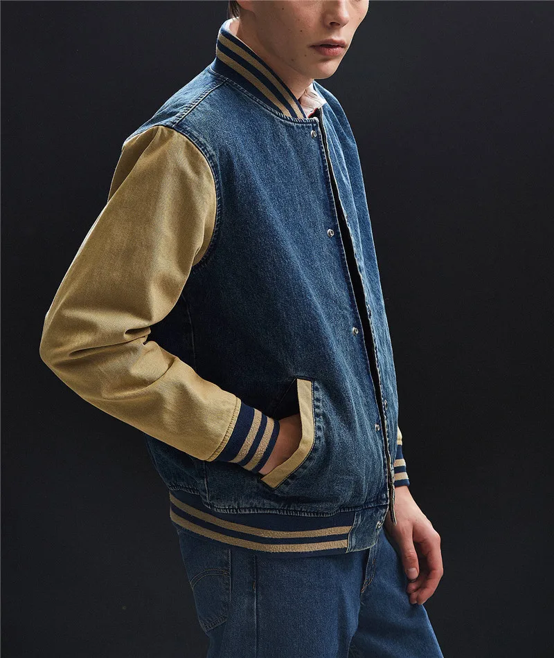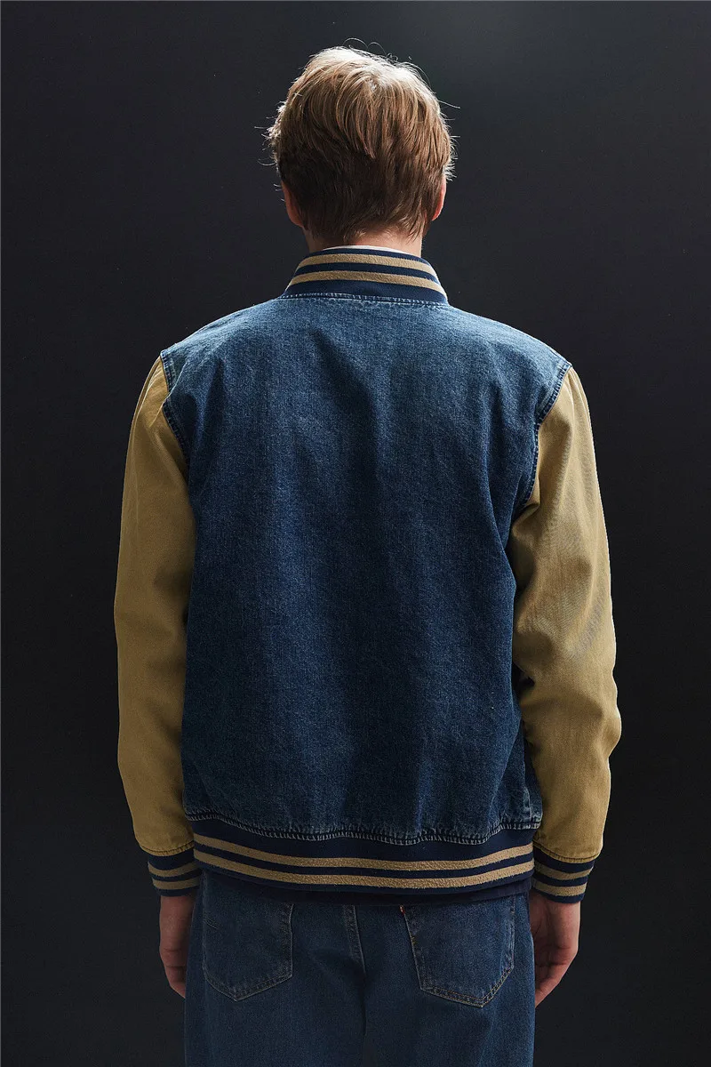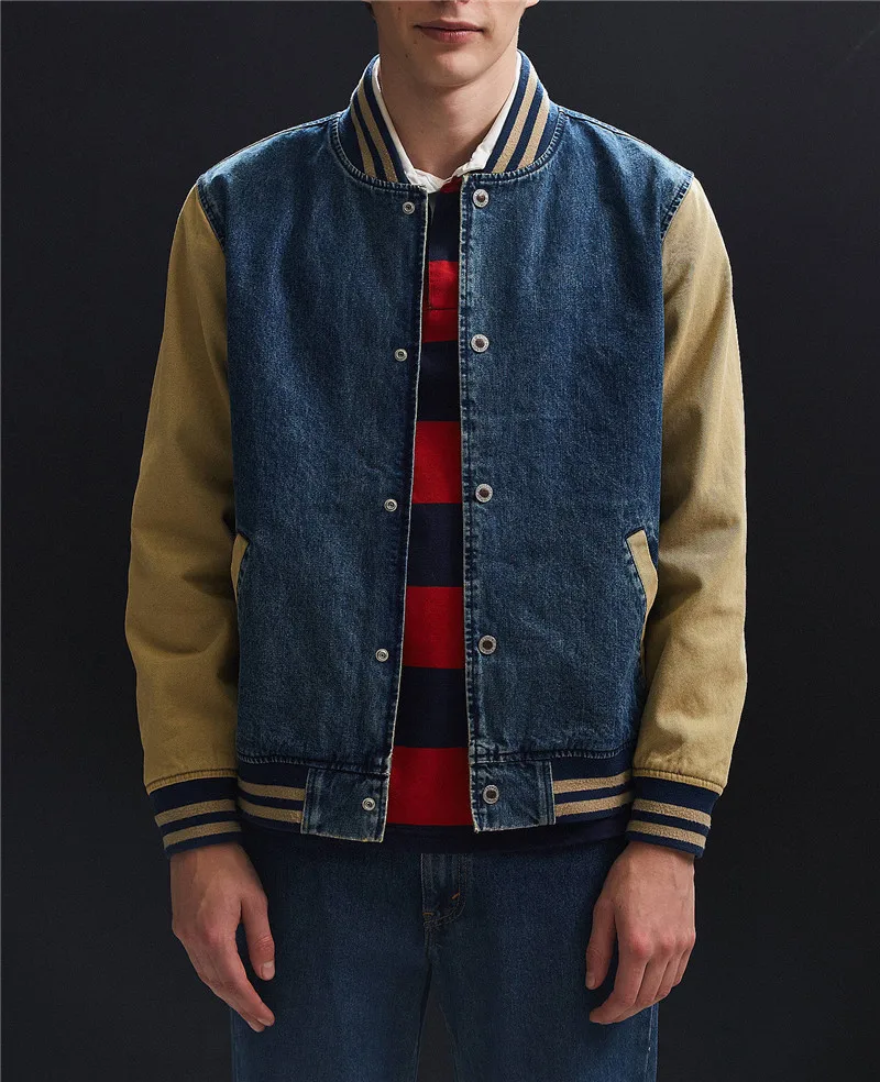 Wholesale indigo contrast sleeves pockets denim varsity jacket
