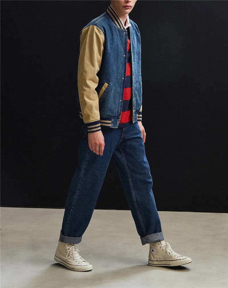 Wholelsale indigo contrast sleeves pockets Denim varsity jacket